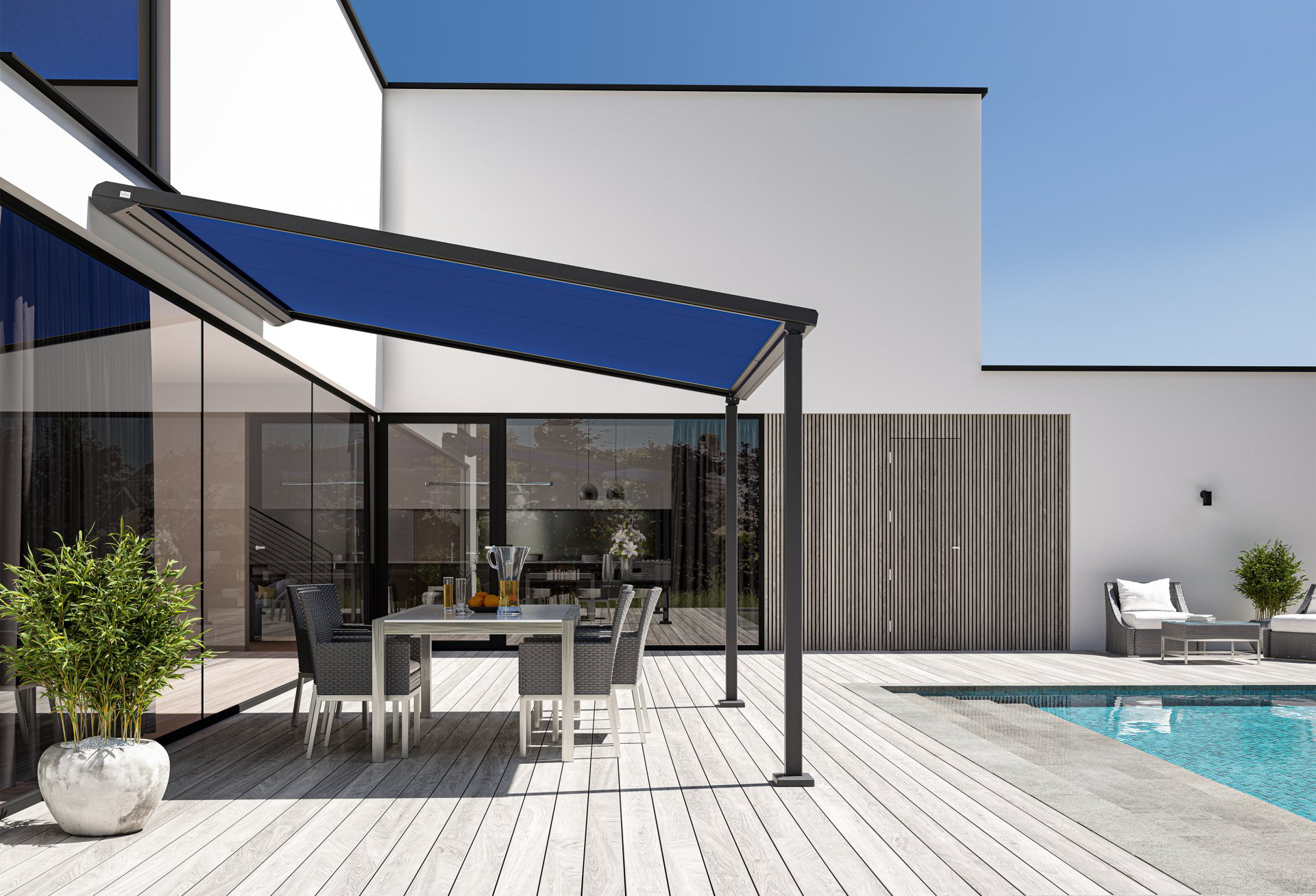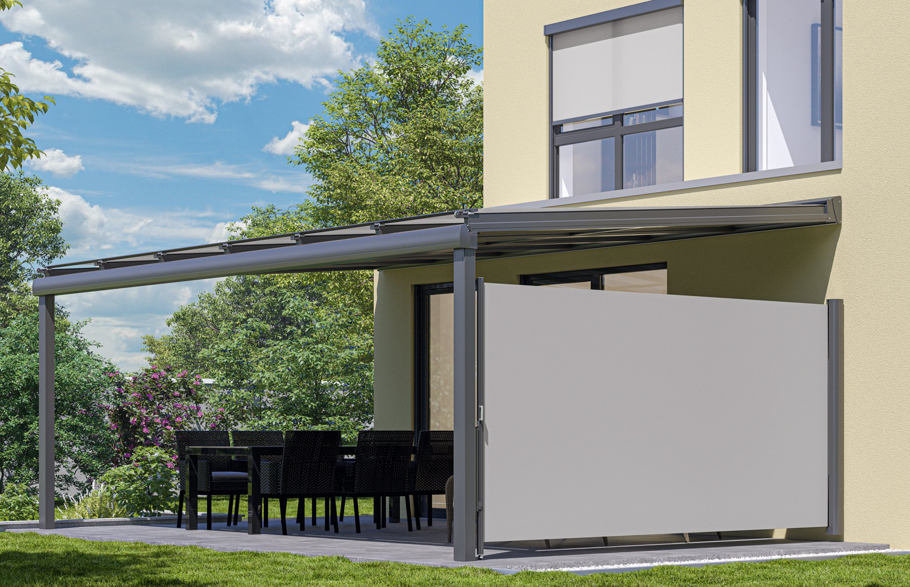 Die Pergola-Markise hat zwei seitliche Führungsschienen und feste Abstützungen.